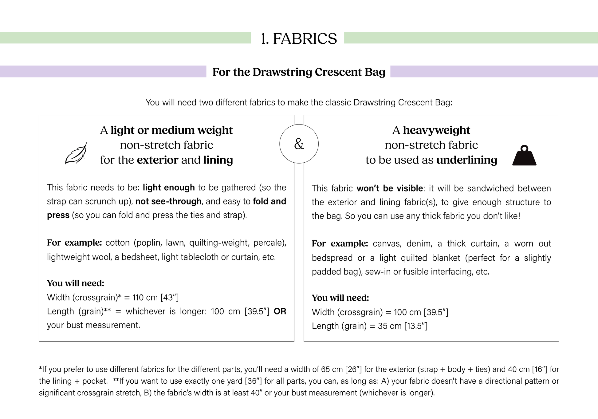 The Drawstring Crescent Bag is designed to comfortably fit a book, a medium water bottle, and glasses case, *as well as* all your essentials like your phone, wallet, and keys, with plenty of space for other things. The length of the strap is based on your own measurements and preference. The finished bag can fit a 37 cm x 20 cm [14 9/16” x 7 7/8”] rectangle. All measurements are provided in metric (cm) and imperial (inches) throughout the pattern.