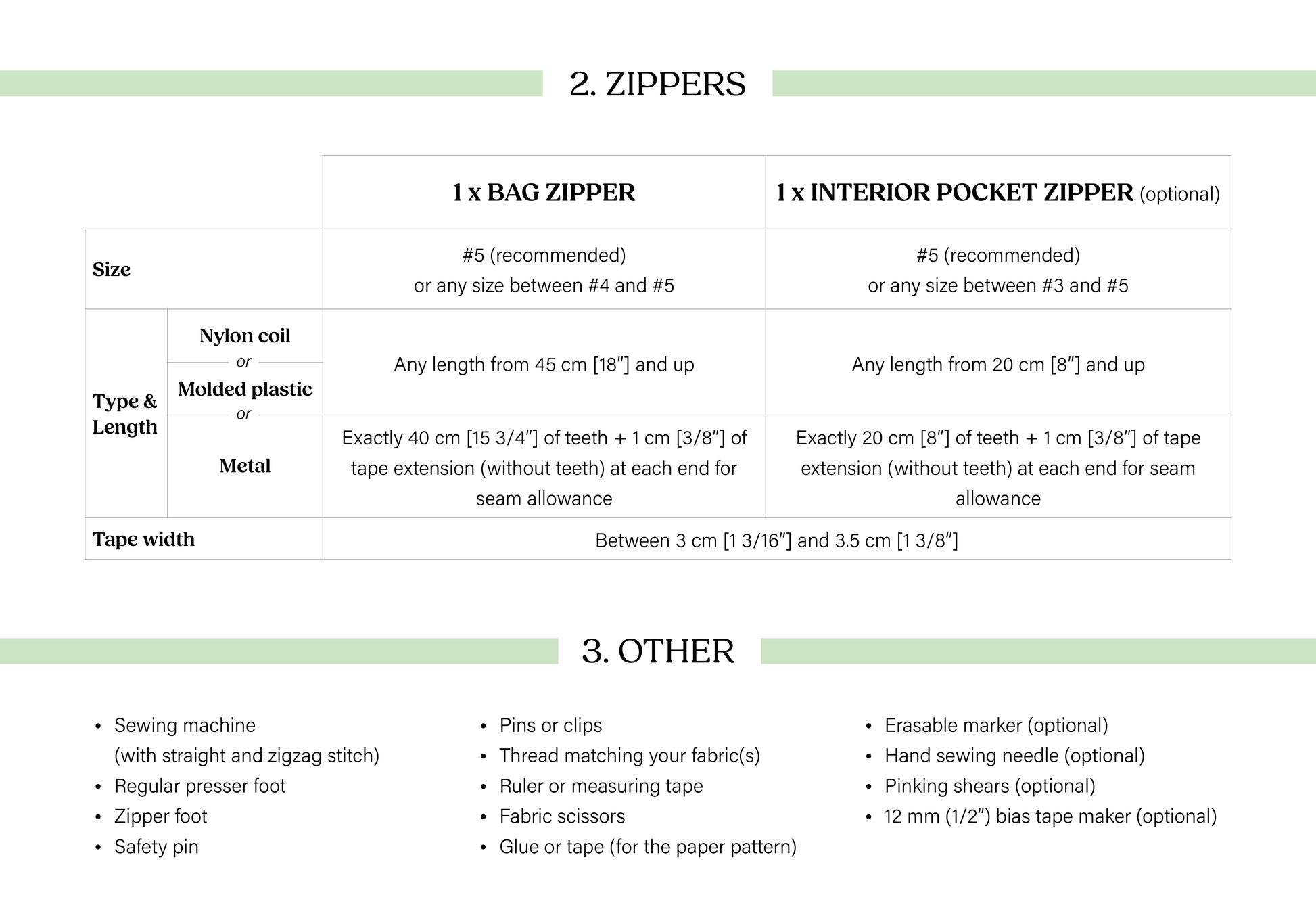 Have a look at the product photos for fabric and zipper requirements/recommendations. If you're not sure about some of the technical terms used, don't worry, they're all explained in the glossary in the instruction booklet.